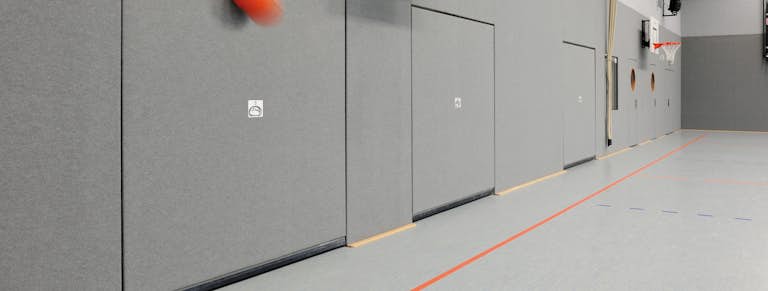 La porte pour salle de sport Hörmann satisfait aux prescriptions de prévention des accidents pour les écoles. Le tablier de porte a été testé à l’épreuve des lancers de ballon selon la norme DIN 18032-3. Le cadre de porte est composé de solides tubes rectangulaires avec entretoises de renfort horizontales et a été parfaitement préparé pour un remplissage par l’utilisateur. Des contrepoids et des amortisseurs de butée garantissent une manœuvre de porte très aisée et sûre.