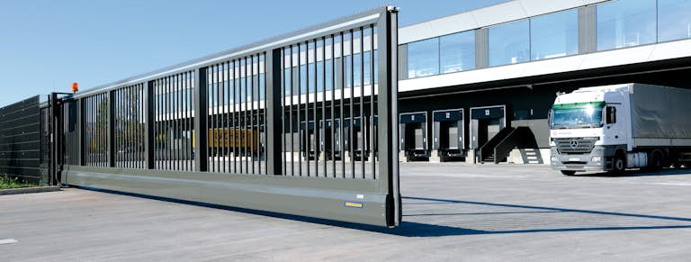 Les portails coulissants Hörmann en solides profilés d’acier sont livrés en une unité complète jusqu’à une largeur d’ouverturede 16 mètres. Il est ainsi possible d’atteindre une largeur de 32 mètres en cas d’installations en vis-à-vis. La construction est autoportante. Avantages : peu de travaux de fondation, aucun montage de rails de guidage, aucune gêne du mouvement du portail en cas de verglas, de neige ou de salissures. Tous les modèles de porte comprennent de série une fonction de démarrage progressif avec la commande par impulsion pour un démarrage en douceur de la porte : cela ménage la porte et la motorisation.