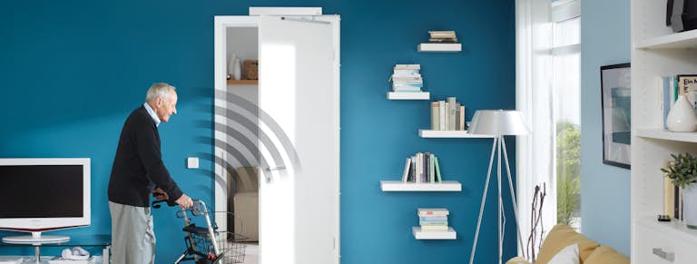 Les portes automatiques ne facilitent pas seulement le quotidien des personnes handicapées ou des seniors. Pour les parents avec des poussettes ou les personnes ayant des sacs lourds dans les mains, une maison facilement accessible est également particulièrement confortable et pratique. La motorisation de porte d’intérieur PortaMatic de Hörmann permet d’ouvrir et de fermer automatiquement les portes d’intérieur et les portes d’intérieur en acier en toute simplicité avec les accessoires de commande adaptés tels que les interrupteurs muraux, les émetteurs sans fil, l’appli BlueSecur Hörmann via Bluetooth ou avec l’unité centrale Smart Home Hörmann homee.