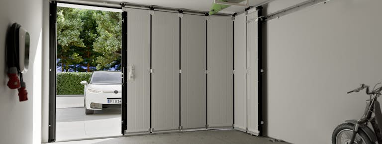 Les portes sectionnelles latérales Hörmann sont la solution idéale pour les situations de montage particulières. Contrairement aux portes de garage enroulables, aux portes sectionnelles et aux portes basculantes, ce type de porte ne s’ouvre pas vers le haut, mais latéralement. Un avantage indéniable lorsque l’on souhaite par exemple utiliser le plafond du garage comme espace de rangement (pour des planches de surf ou autres) ou lorsque, pour des raisons de construction (pente de toit, linteau réduit ou bien tuyaux d’écoulement gênants), le tablier de porte ne peut être monté au plafond ou venir se placer sous ce dernier.